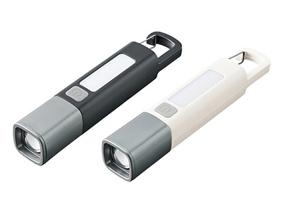 ハンディライトとランタンになる2WAY仕様のLEDライトです。ボタンを1回押すとハンディライトが点灯、もう一度押すと点滅、さらにもう一度押すことでランタンが点灯します。また充電式で、本体背面のtype-Cポートから充電が可能です。ハンディライトの照射方法は2モードから選択可能で、ハンディライトの状態でシルバー部分を伸ばすと遠くを集中的に照らす「スポットモード」に、シルバー部分を収めると広範囲を照らす「ワイドモード」に切り替えることができます。本体上部にはカラビナがついており、吊り下げて使うこともできます。防災キャンペーンのオリジナルグッズや、社内の防災備品などにご提案ください。 |